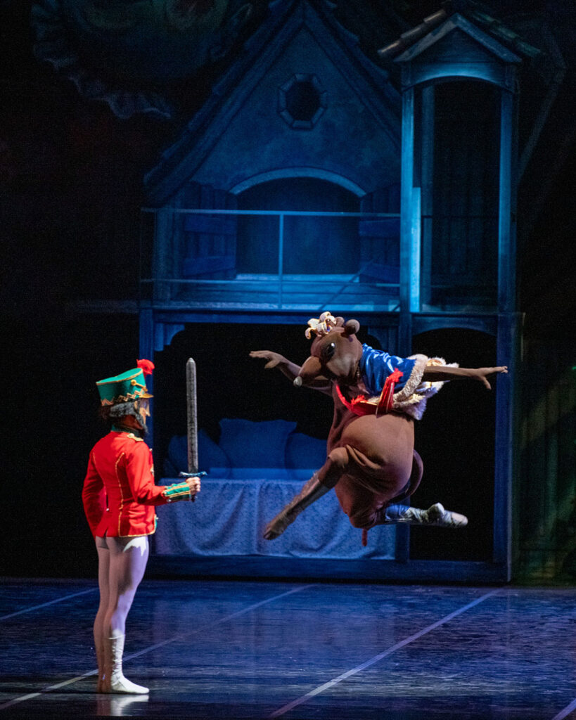 Dentro del universo narrativo, Tío Drosselmeyer, interpretado por David Juárez, funciona como eje articulador del artificio. Su presencia escénica es precisa y contenida, más cercana al narrador funcional que al demiurgo inquietante que algunas versiones exploran. El Rey Ratón, a cargo de David Gómez, cumple eficazmente su rol antagonista, aunque sin el peso dramático suficiente como para tensionar verdaderamente el clima del primer acto.