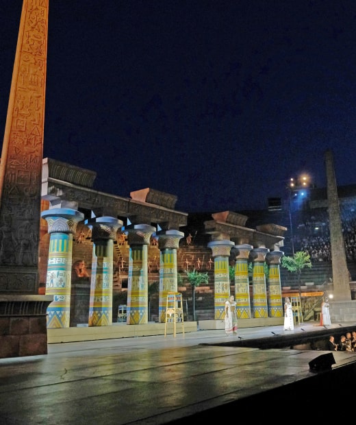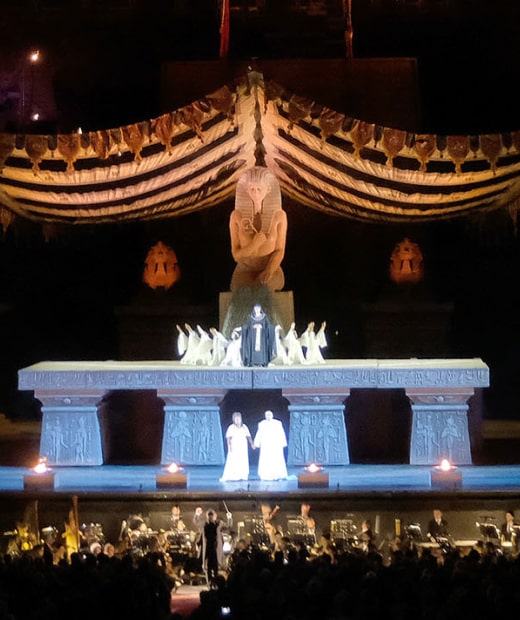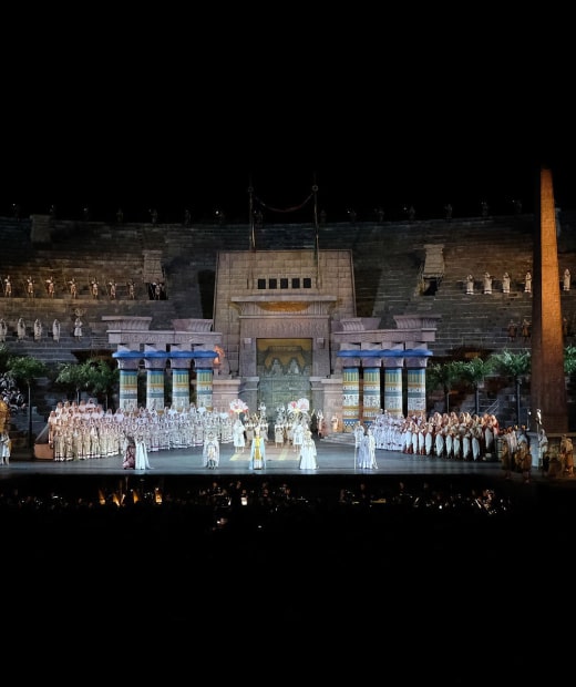 La producción escénica de 1913 de Aida regresa este año a la Arena de Verona, una de las puestas más icónicas de la historia de la ópera. Bajo la dirección del maestro del teatro italiano, Gianfranco de Bosio, esta versión se inspira en los bocetos del arquitecto Ettore Fagiuoli, creados para la primera presentación de Aida en la Arena el 10 de agosto de 1913, a pedido de Giovanni Zenatello y Ottone Rovato. Además, sigue los arreglos escénicos originales que el propio Verdi supervisó para el estreno italiano de 1872, logrando una recreación histórica impresionante. Con su grandiosidad escenográfica y su fidelidad al Egipto faraónico, la producción de Aida 1913 se alza como un festín visual y auditivo que, bajo los cielos estrellados de Verona, transporta al público a una época dorada de la ópera.