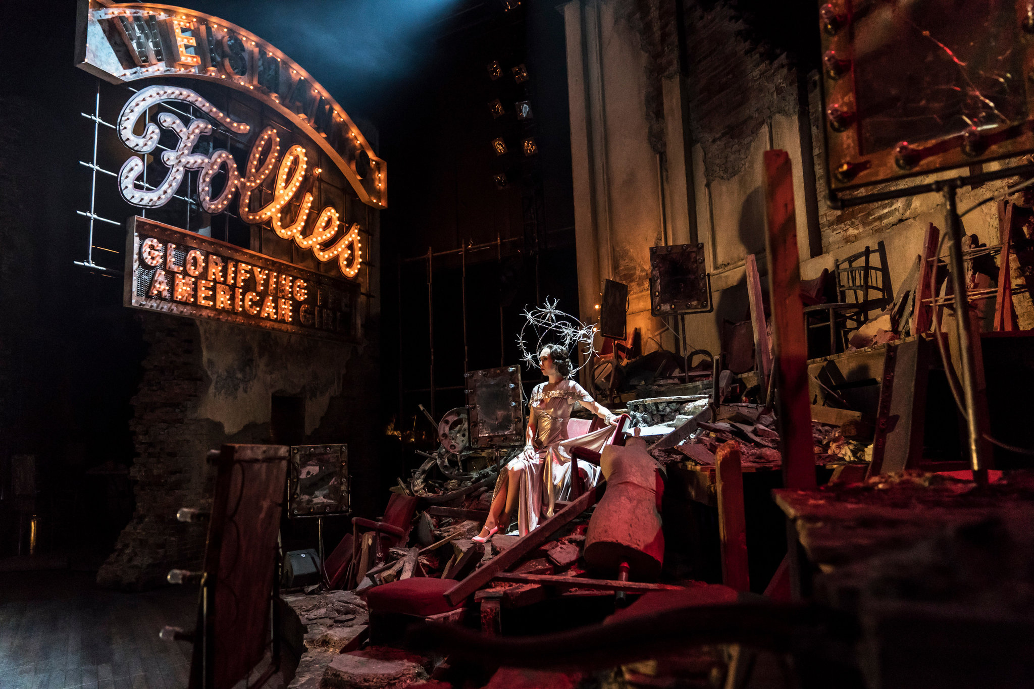 El punto de partida —un viejo teatro a punto de ser demolido donde antiguas estrellas de las “Weismann Follies” se reúnen para una última celebración— funciona como una poderosa metáfora. El escenario diseñado por Vicki Mortimer muestra un edificio en ruinas, con balcones quebrados y terciopelos gastados que evocan la gloria pasada del espectáculo. Allí, entre polvo y recuerdos, los personajes se enfrentan a las decisiones que marcaron sus vidas.