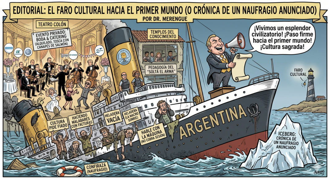 (La Cultura… sí, claro. Esa señora elegante que acá viene en harapos, pide fiado y encima te mira con culpa. Porque si esto es un faro, alumbra para el lado equivocado y con la lamparita quemada. Acá lo único que prospera es la cultura del “arreglate como puedas y agradecé”. Primer mundo… ¡si somos un experimento social en vivo para espectadores extranjeros!)