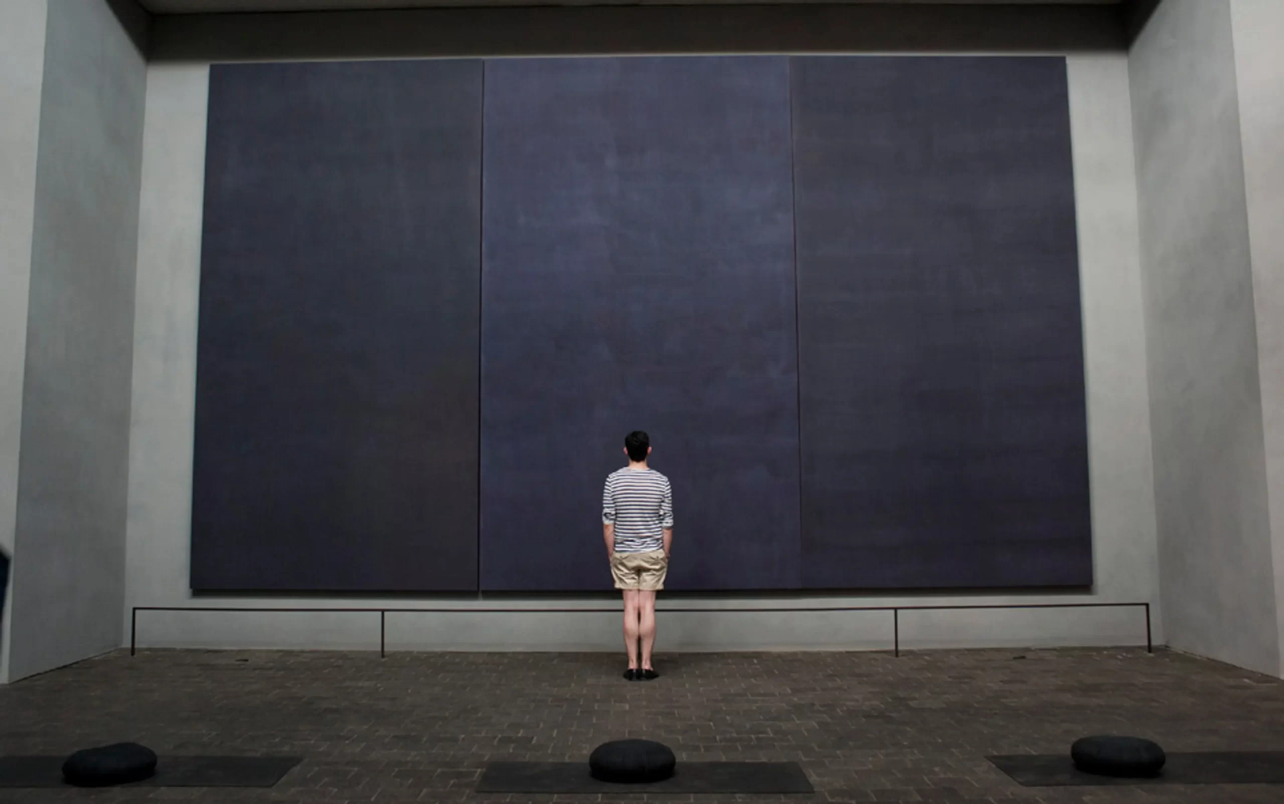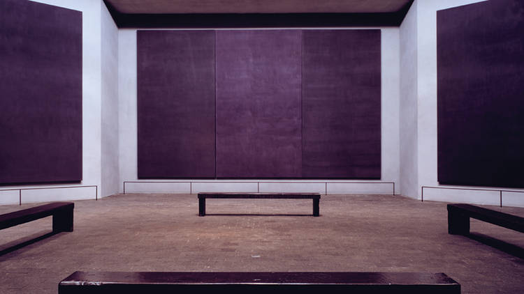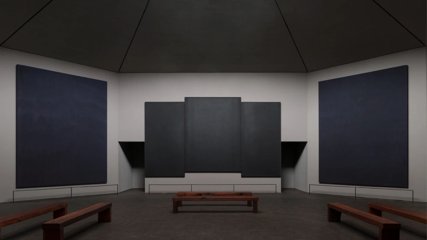 El espacio está rodeado por catorce enormes lienzos de tonos casi negros. En lugar de una galería tradicional, el visitante entra en una especie de santuario laico donde las pinturas funcionan como superficies de meditación.