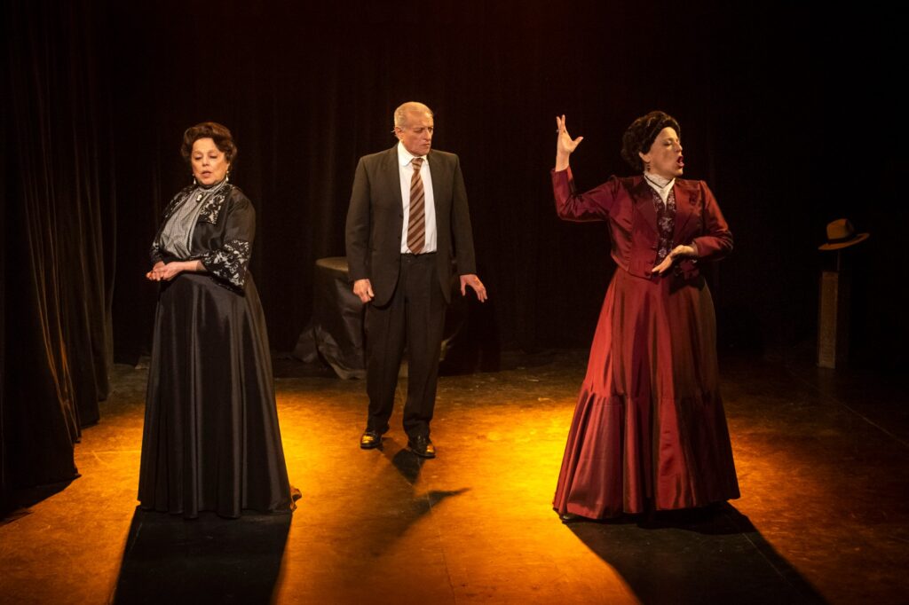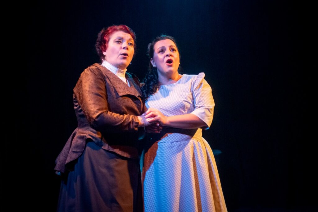 El dispositivo escénico se apoya en dos planos narrativos: a la derecha del espectador, una Regina octogenaria (Terranova) dialoga con su sobrino Adams (Cali Mallo); a la izquierda, un conjunto de cantantes y actores revive episodios de su vida. La música compuesta por Fernando Albinarrate cumple un papel clave: su partitura envuelve la narración con un marco sonoro evocador, aunque confirma la indefinición del espectáculo. La obra se convierte en un híbrido que oscila entre lenguajes: no alcanza la estructura de una comedia musical, pero tampoco se adentra en la expresividad de la ópera o bien en un elemento narrativo de bioepic. Esta ambigüedad le da cierta originalidad, aunque también limita su potencia dramática. En este apartado musical, resulta especialmente destacable el compromiso en vivo de la Mtra. Susana Frangi, quien asume la dirección musical con rigor y sensibilidad, aportando un marco sonoro funcional y preciso que acompaña sin invadir, reforzando la cohesión entre relato y escena. Asimismo es de notar el vestuario de época creado por Fernando Ferrigno el cual pasa de fines del S XiX ha los años 60, del esplendor de antaño a lo comun de final de vida, asi mismo la iluminación que encuadra los recuerdos de vida realizado por Oscar Bonardi, da un encuadre de historicidad a esta Regina…