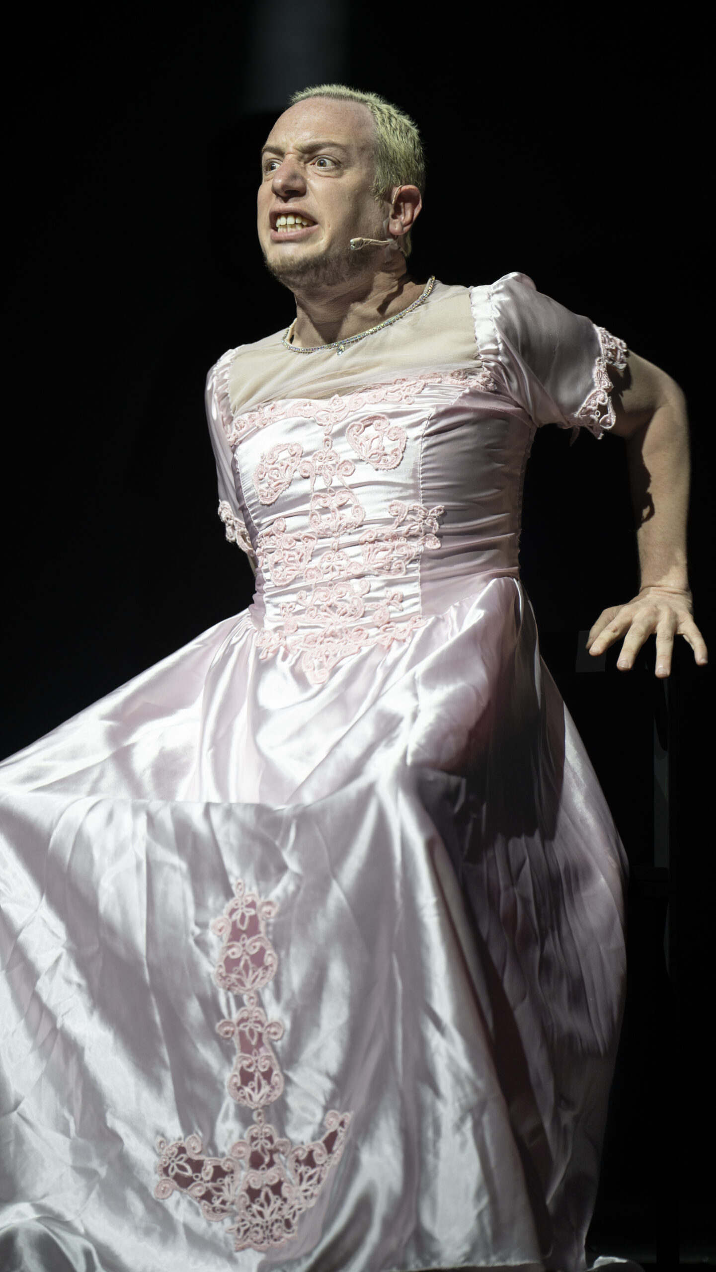 Rechimuzzi abre la obra con una confesión leída, un susurro que nos lleva de la mano a su mundo y presenta a Alejandra, una figura que trasciende el escenario. No es solo un personaje; es una presencia que encarna la lucha, la euforia, la fragilidad de quienes viven al filo de lo que el mundo llama “normal”. Rechimuzzi la habita con una entrega que desarma: su cuerpo, su voz, su mirada hacen que el público quiera protegerla, entenderla, reír con ella. A través de un desfile de personajes —el animador agotado, la madrina que esconde el dolor tras bromas, los ecos de una familia que celebra y lastima—, Alejandra se revela como un símbolo universal. Todos llevamos algo de ella: esa parte que teme el juicio, pero anhela ser vista. La versatilidad de Rechimuzzi, que salta entre personajes con una precisión casi mágica, sostiene un ritmo que rara vez decae, aunque la ambición de abarcar tantas facetas de la locura puede dejar algunas ideas, como la relación entre pobreza y estigma, más sugeridas que exploradas.