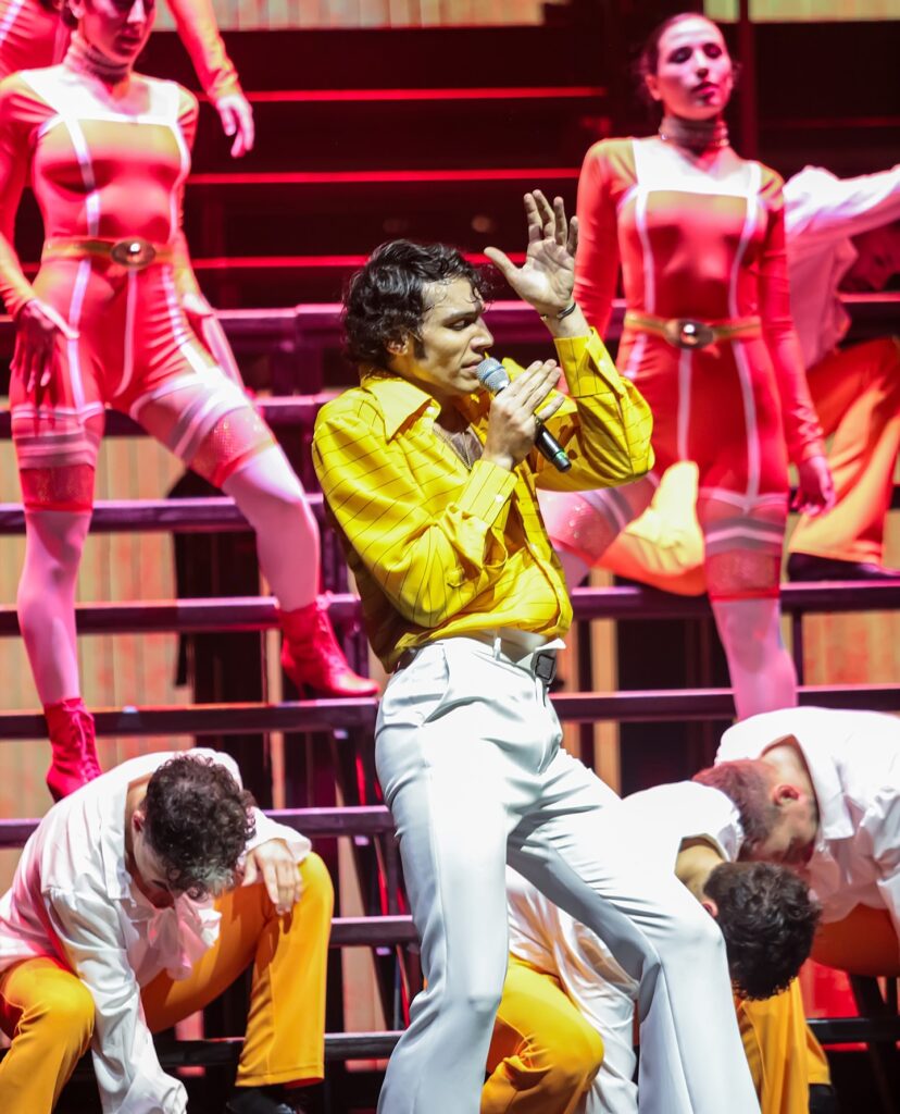 «Sandro, el Gran Show» se presenta como un festín visual y sonoro que aspira a capturar la magia de Sandro a través de 40 canciones –¡nada menos!– que abarcan desde los himnos imperecederos como “Rosa, Rosa”, “Dame Fuego” y “Penumbras” hasta gemas menos conocidas como “Abriéndole la puerta al diablo”. La escenografía de Mariana Tirantte, con pantallas LED y una estructura de dos niveles, evoca los conciertos vibrantes del Gitano en su apogeo, mientras transporta al público a un escenario digno de los grandes musicales de Broadway o el West End. Las coreografías de Verónica Pecollo, ejecutadas por un ensamble de 16 bailarines, son un torbellino de energía, precisas y llenas de vida, mientras que el vestuario, también diseñado por Sans, destila el glamour sensual que definía a Sandro, con telas brillantes y cortes que despiertan la nostalgia.