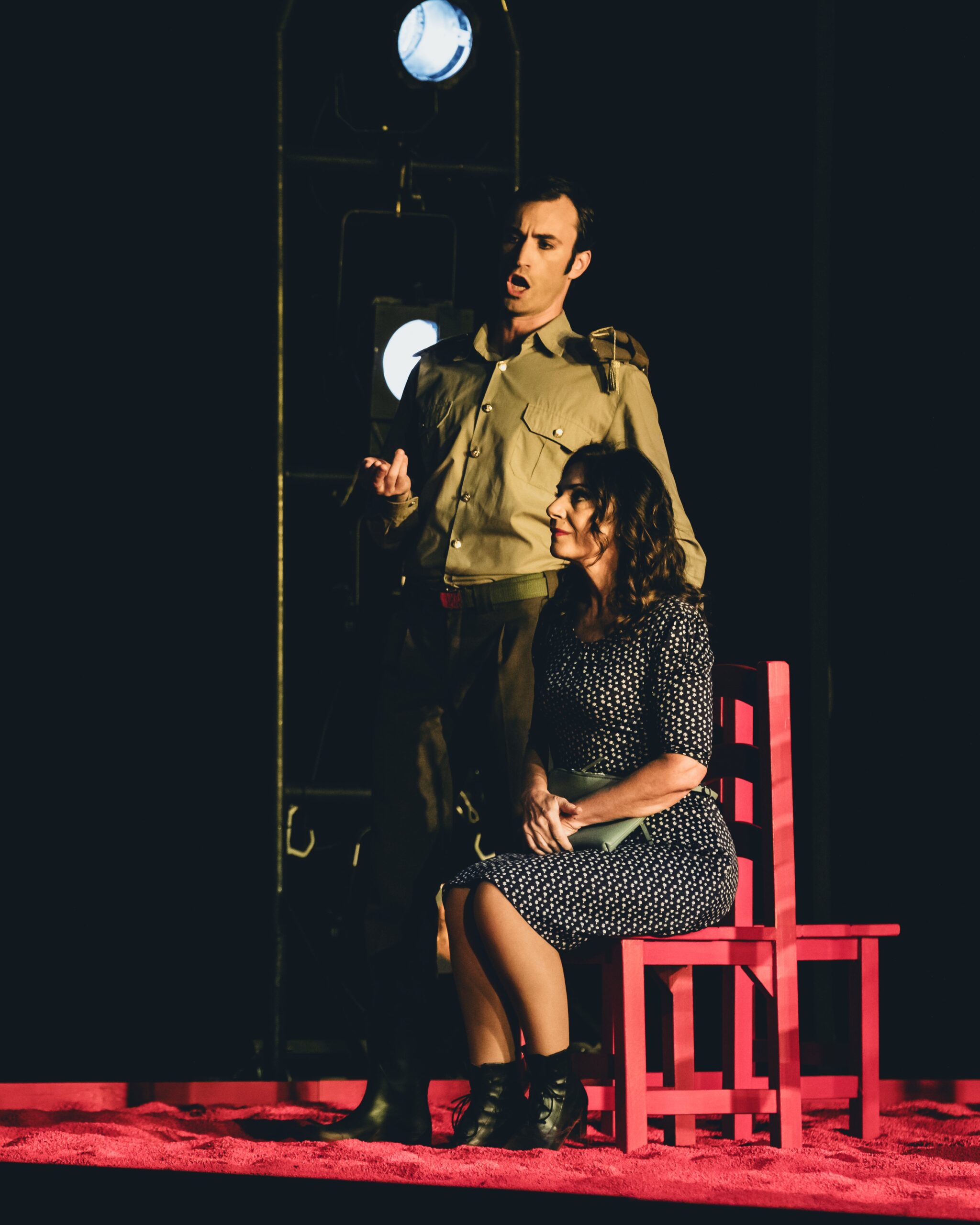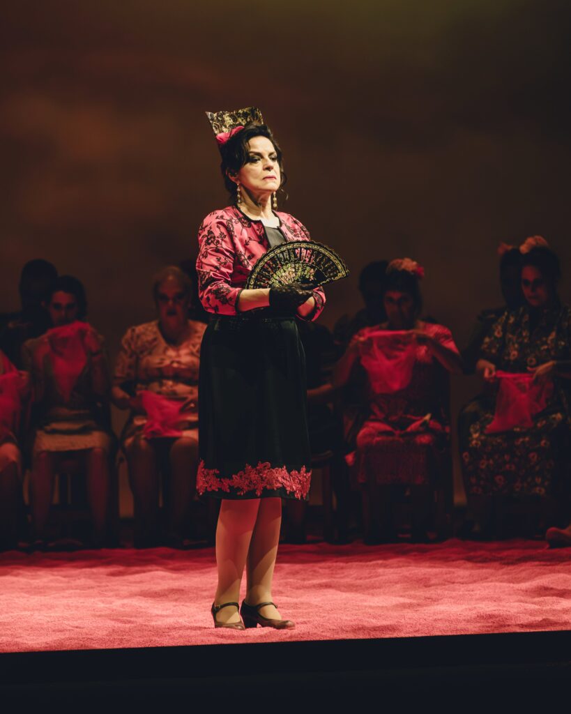 El concepto visual de Sagi —atemporal y simbólico— terminó por ofrecer más ambientación que verdadera dirección actoral. Muchas escenas transcurrieron en proscenio con movimientos escasos, mientras la arena roja complicaba desplazamientos y convertía ciertos momentos dramáticos en un curioso ejercicio de equilibrio.
