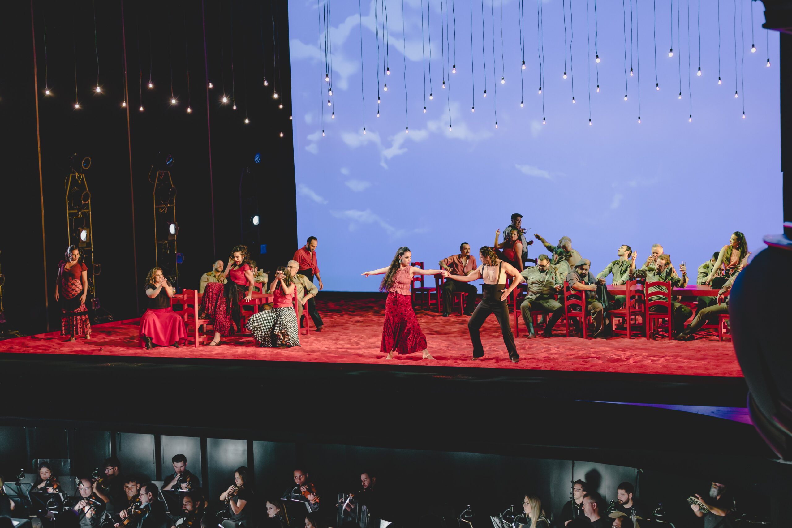 Lo que sí resultó llamativo fue el intento de introducir flamenco escénico en ese mismo acto. El problema es que ese baile —fundado en el vigor del zapateo— se desarrollaba sobre el ya mencionado “arenero” escénico, lo que volvía el gesto coreográfico casi un sinsentido dramático.