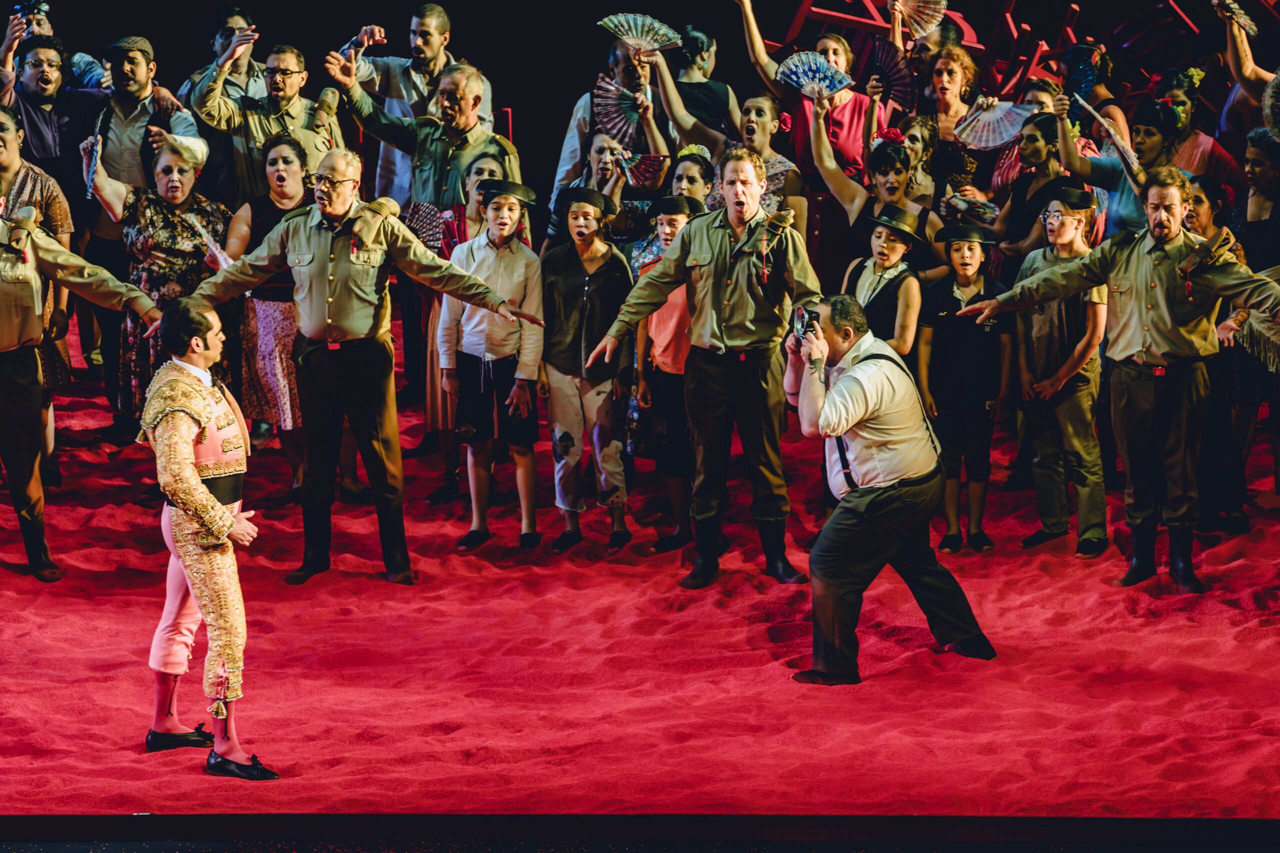 La propuesta escénica de Emilio Sagi tampoco ayudó a disipar dudas. Sobre una superficie rojiza que pretendía evocar la arena de una plaza de toros —aunque el espectador jamás terminara de comprender qué sustancia escénica se utilizaba— Carmen apareció con un vestuario que provocaba una inesperada sensación de déjà vu.